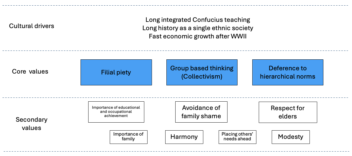 First, the top two values from the research - collectivism and deference to authority/hierarchy - closely match two of my core cultural forces. I also elevate filial piety as a core value. Together, these three form the foundation from which most of the other secondary values emerge.
